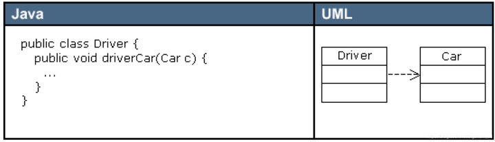 - 依赖(Dependency)关系是一种弱关联关系。如果对象A用到对象B,但是和B的关系不是太明显的时候,就可以把这种关系看作是依赖关系。如果对象A依赖于对象B,则 A “use a” B。比如驾驶员和汽车的关系,驾驶员使用汽车,二者之间就是依赖关系