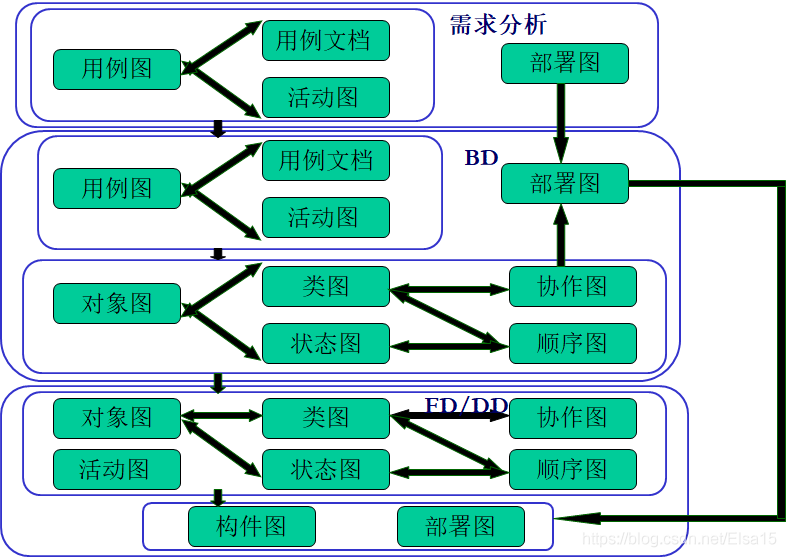 九大图在各个阶段的使用:(BD:基本设计,FD:功能设计,DD:详细设计)
