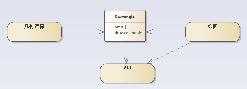 这种设计违反了单一职责原则,因为Rectangle类具有两个职责:一个职责提供画矩形几何图形的功能,一个职责提供了计算矩形面积的功能