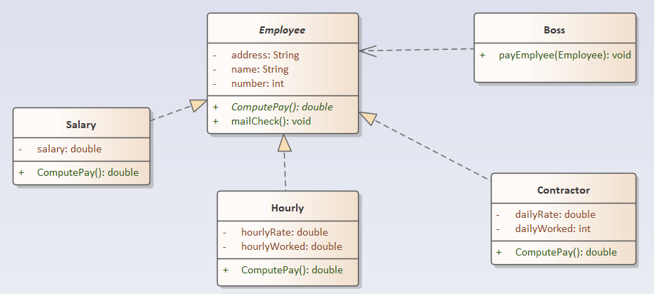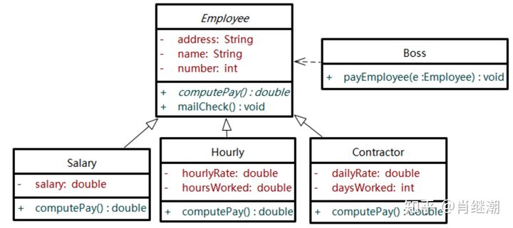 - 于是,Boss类就依赖于抽象类Employee,而不依赖于具体的实现类Salary、Hourly、Contractor等