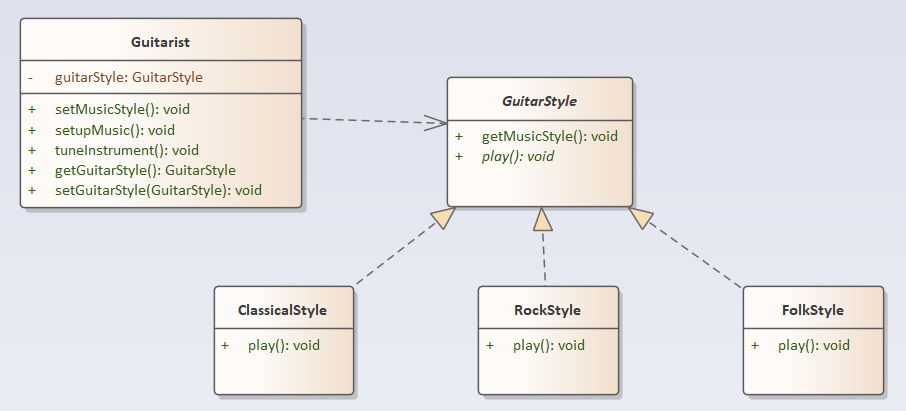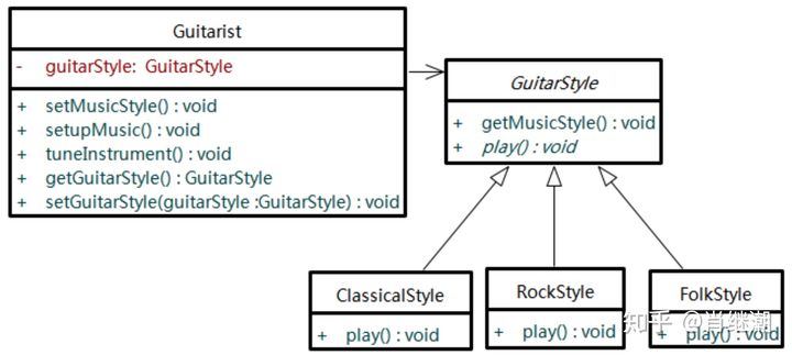 - 对于Guitarist类来说,setupMusic() 和 tuneInstrument() 相当稳定,但是play()方法却并非稳定的。一首歌曲可以有几种不同的演奏风格:古典风格、民谣风格、佛拉明戈风格、摇滚风格等。这就意味着根据演奏风格的不同,play()方法有所不同。因为根据演奏风格,类的行为会有所改变,我们就需要将这个行为抽象出来,将它封装到另一个类中。下图是封装并隔离变化点后的类图