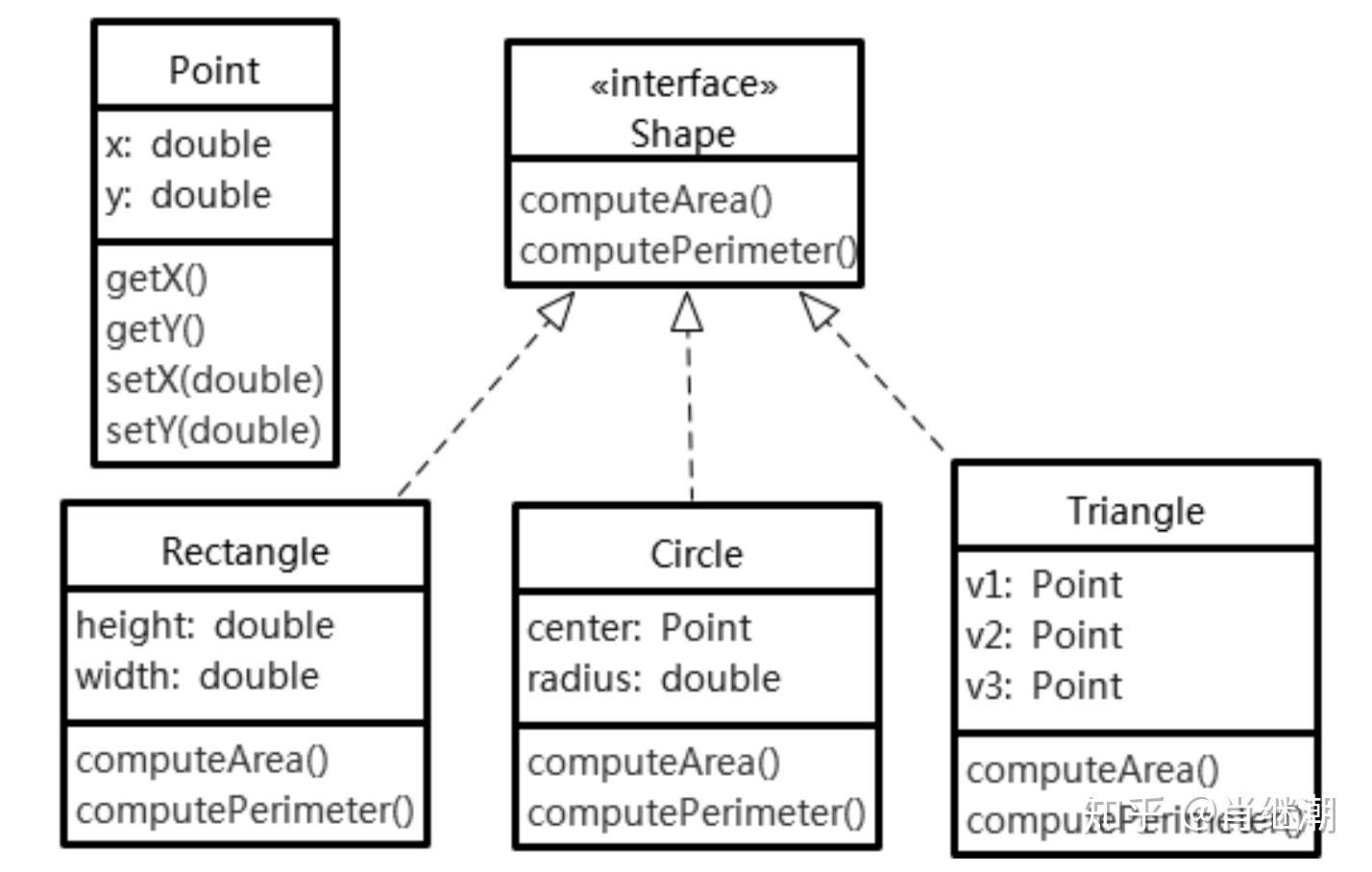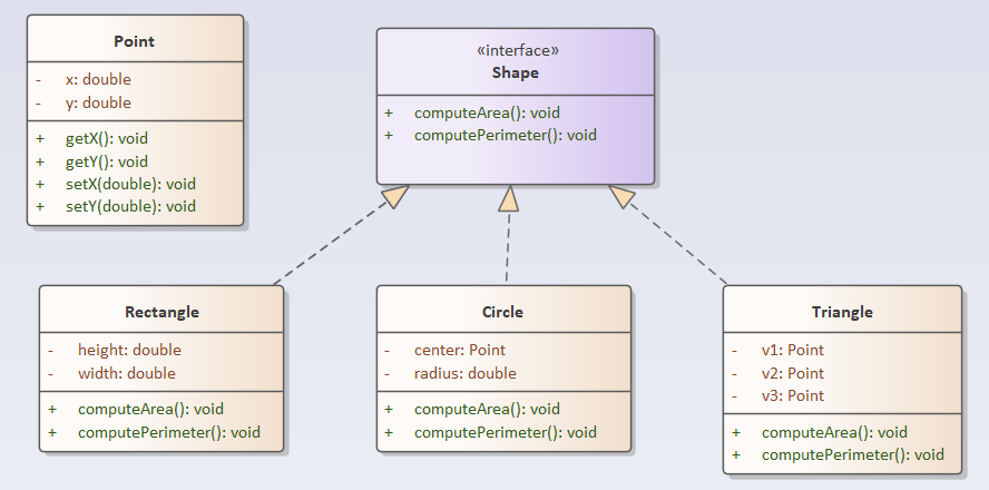 在上述代码中,我们面向接口而不是面向实现编程,针对接口Shape编程,而不是针对接口的具体实现类Circle、Rectangle、Triangle等编程,程序的灵活性、可扩展性更强
