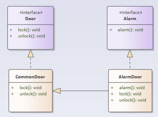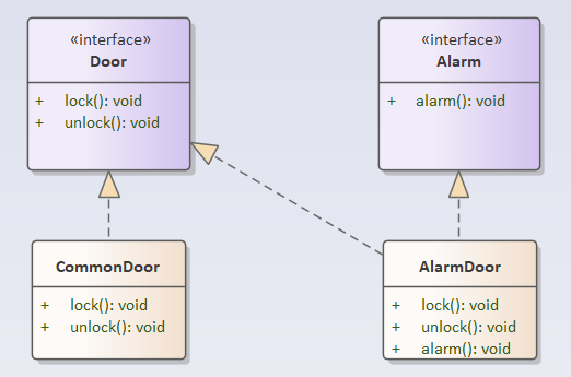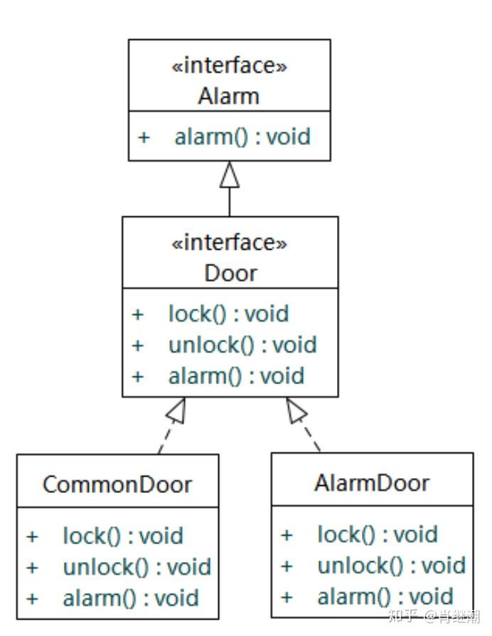 那么,好吧,将报警功能从Door中分离出来,封装成一个Alarm接口。在Alarm接口定义alarm()方法,在Door接口定义lock()和unlock()方法,Door接口继承Alarm接口,如下图所示。现在一个接口根据功能分成了两个接口,貌似设计要更好一些。但是,可惜的是:跟第一种方法一样,依赖Door接口的CommonDoor却不得不实现未使用的alarm()方法,也就是说接口Door被接口Alarm“污染”了,这种设计同样违反了接口隔离原则