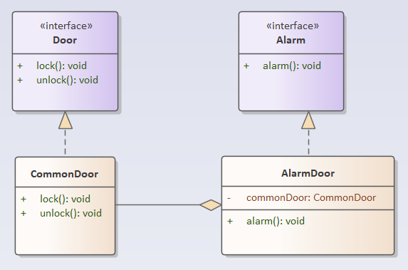- 第三种方案为:通过委托分离接口。在这种方法里,AlarmDoor实现了Alarm接口,同时把功能lock和unlock委托给CommonDoor对象完成。这种设计遵循了接口隔离原则。实际上,这种方法是对第三种方法的第二个方案应用了组合/聚合复用原则,将AlarmDoor和CommonDoor的继承关系转换为聚合关系
