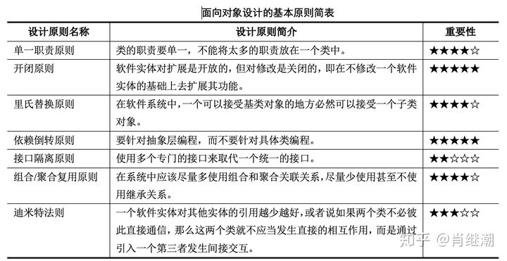 - 面向对象软件设计大师们在长期的软件设计实践中,总结出七条软件设计的基本原则,包括:单一职责、开闭原则、里氏替换原则、依赖倒转原则、接口隔离原则、组合/聚合复用原则、迪米特法则。遵循这七条原则来设计类,将提高软件系统的质量,做到高内聚、低耦合,从而实现较高可扩展性、可复用性、可维护性。这些面向对象的设计原则是面向对象设计的基本指导思想。下表列出了这些面向对象设计原则的概念以及相对重要性