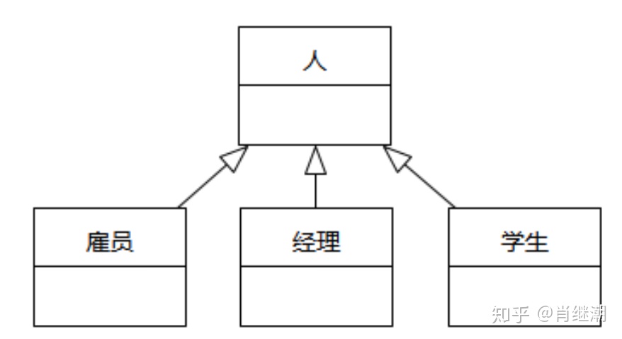 - 我们看一个例子。如果我们把“人”当成一个类,然后把“雇员”、“经理”、“学生”当成是“人”的子类,如下图所示。这种设计的错误在于把“角色”的等级结构和“人”的等级结构混淆了。“经理”、“雇员”、“学生”是一个人的角色,一个人可以同时拥有上述角色。如果按继承来设计,那么如果一个人是雇员的话,就不可能是经理,也不可能是学生,这显然不合理