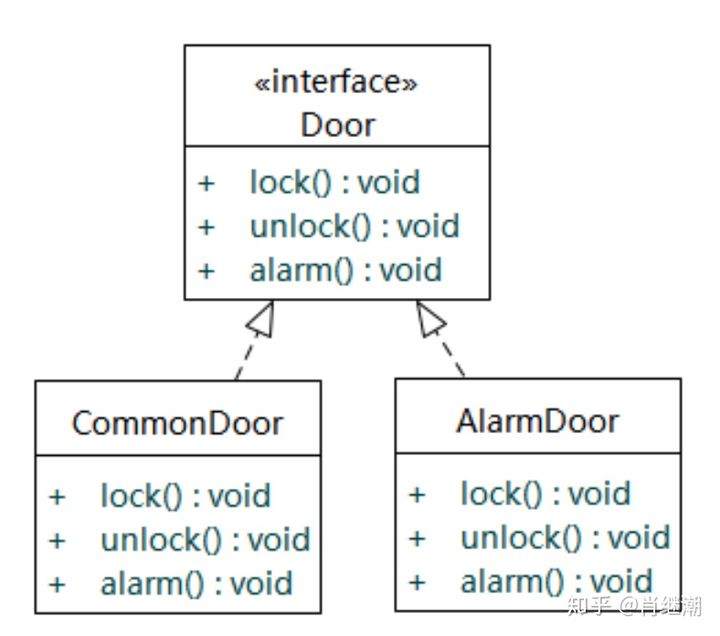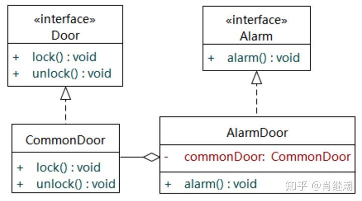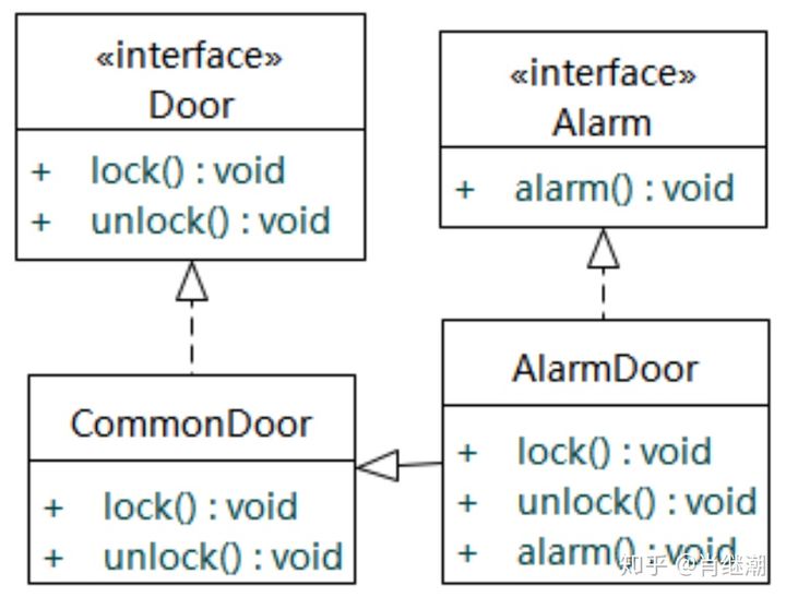 - 第二种方案为:继承CommonDoor,并实现Alarm接口,如下图所示。这两种设计方案都将Door接口和Alarm接口分离了,避免了肥胖的接口和接口污染,都遵循了接口隔离原则,但是第二种方案更具有实用性