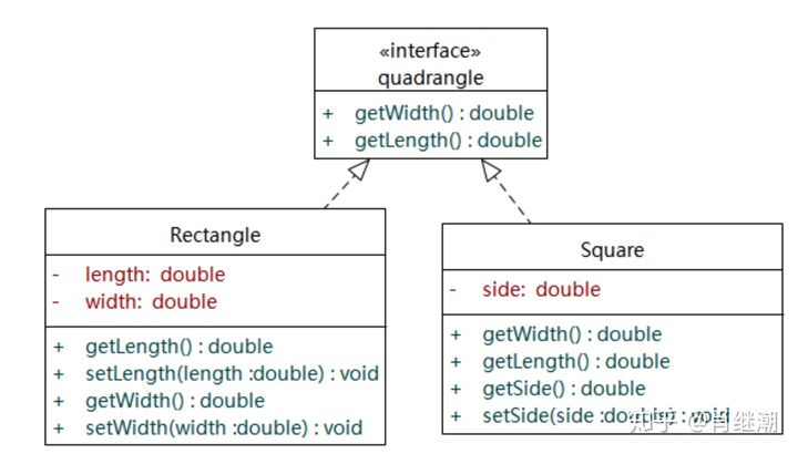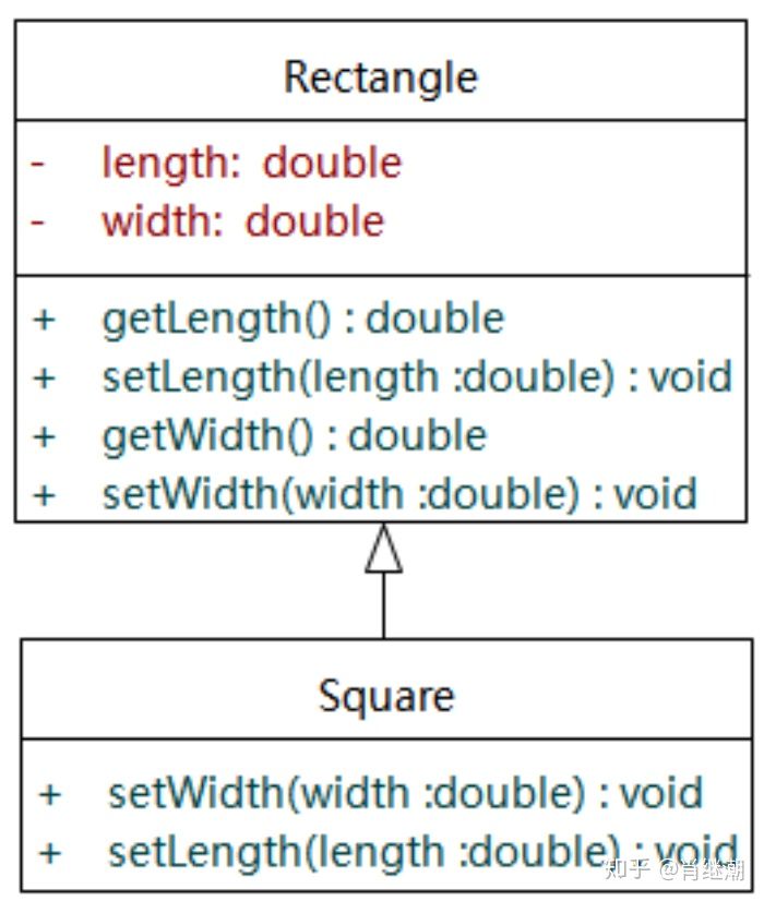 下面我们用示例来阐述。 “正方形不是长方形”是一个理解里氏替换原则的最经典的例子。在数学领域里,正方形毫无疑问是长方形,它是一个长宽相等的长方形。所以,我们开发的一个与几何图形相关的软件系统中,让正方形继承自长方形是顺利成章的事情,于是我们有了如下图所示的设计