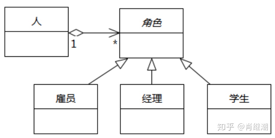 - 正确的设计是有个抽象类“角色”,“人”可以拥有多个“角色”(聚合),“雇员”、“经理”、“学生”是“角色”的子类,如下图所示
