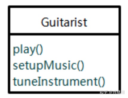 - 例如,假如我们从分析阶段得到一个领域类Guitarist代表吉他演奏家。吉他演奏家的行为包括可以挑选演奏的曲目(setupMusic),可以对吉他校音(tuneInstrument),可以演奏曲目(play),类图下图所示