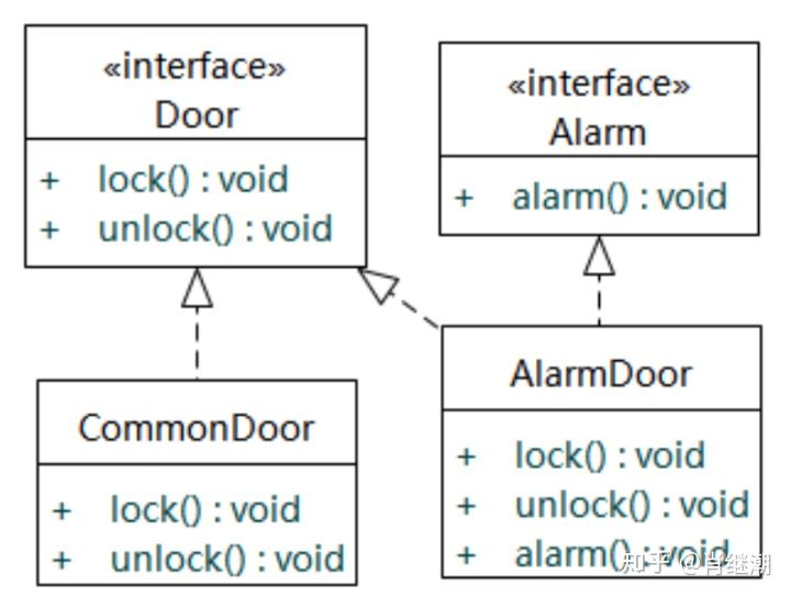 通过多重继承分离接口。多重继承可以有两个方式,第一种方式是同时实现两个接口,属于多重接口继承;第二种方式是实现一个接口,同时继承一个具体类,实际上也是一种多重继承。现在我们继续本例的设计,这次我们为了避免太肥胖的接口以及接口污染,我们在Alarm接口中定义alarm()方法,在Door接口中定义lock()和unlock()方法,这两个接口之间无继承关系。CommonDoor实现Door接口。而AlarmDoor根据多重继承的实现方式,分为两种方案
